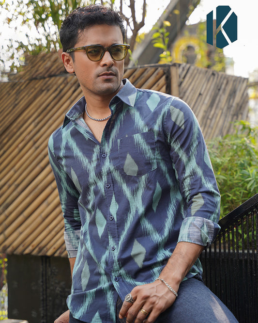 Navy Blue Ikat Print Remi Cotton Full Sleeve Shirt for Men – Bold Artistic Casual Style