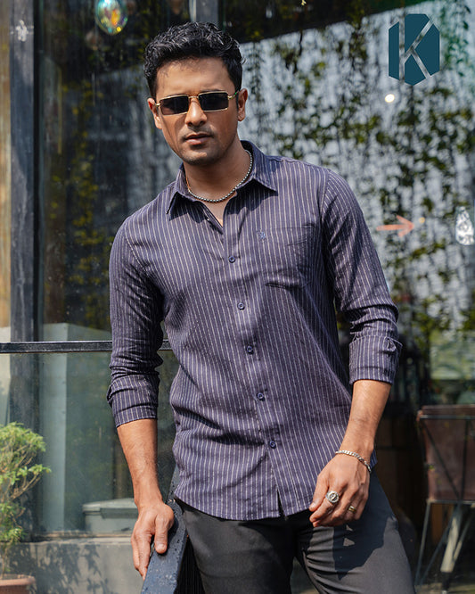 Premium Navy Blue Full Sleeve Shirt - Remi Cotton with Fine White Stripes