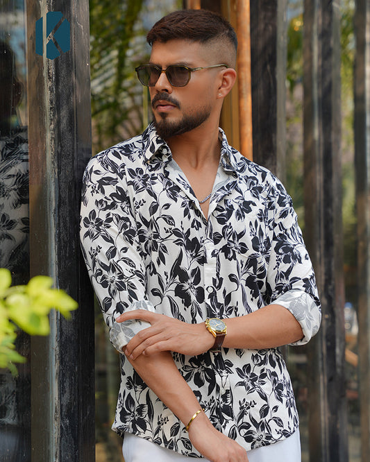 White Floral Print Full Sleeve Shirt - Premium Remi Cotton