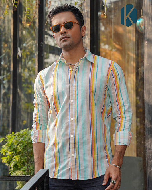 White Multi-Color Striped Remi Cotton Full Sleeve Shirt for Men – Bold Casual Weekend Style