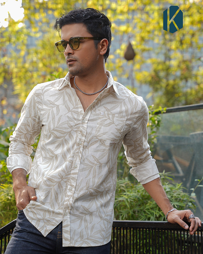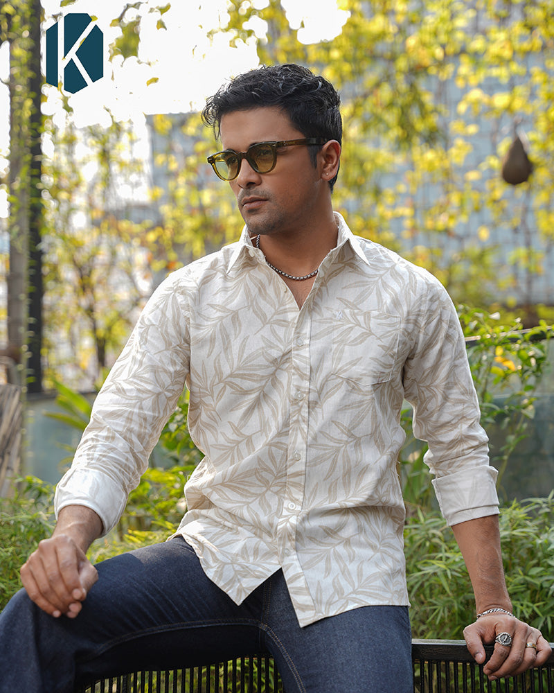 Off-White Botanical Leaf Print Remi Cotton Full Sleeve Shirt for Men – Natural & Effortlessly Stylish