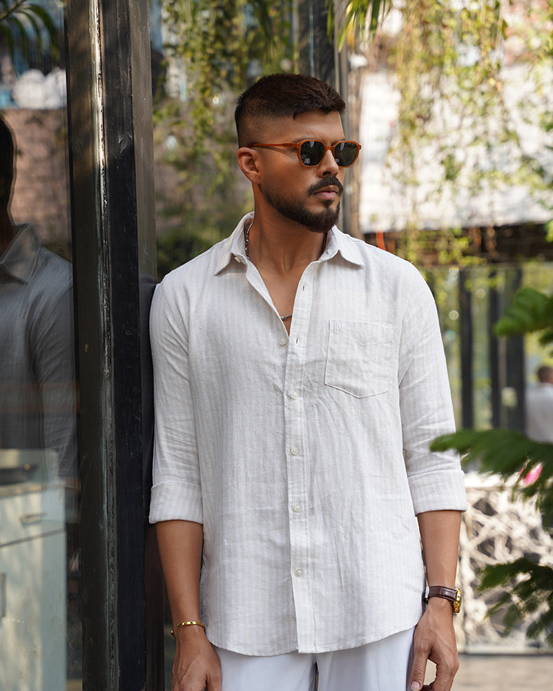 Soft cream base with subtle white pinstripes and a rich textured weave — this is the shirt for men who let quality speak for itself. No loud patterns, no bold colors. Just premium fabric and clean design that quietly says everything.